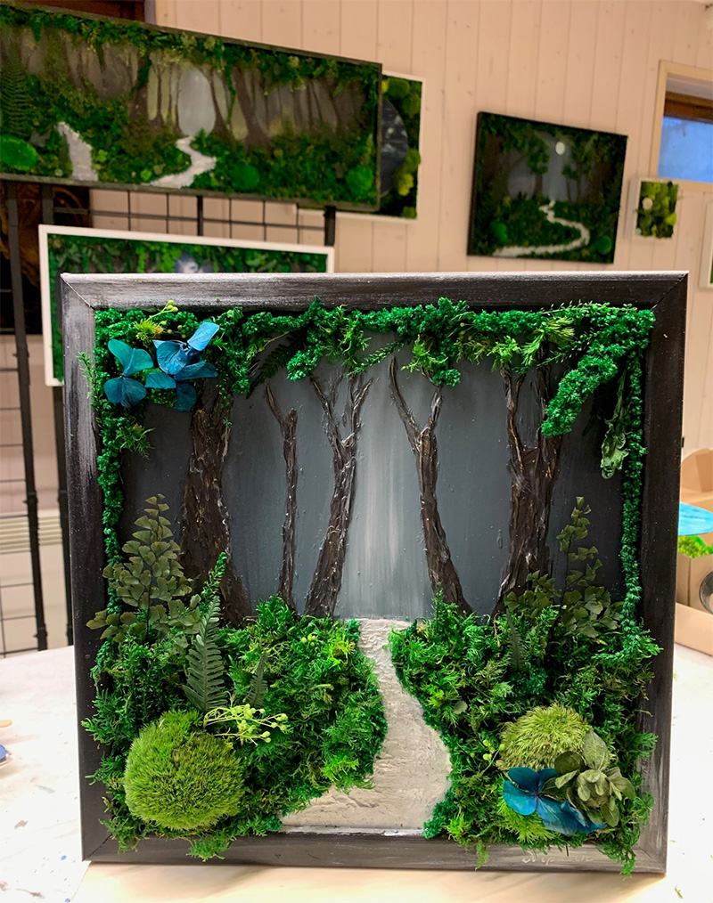 - Cours individuel – matériel complet à disposition et fourni (peintures, végétaux stabilisés, support bois, accroche pour le tableau, colle et autres fournitures)